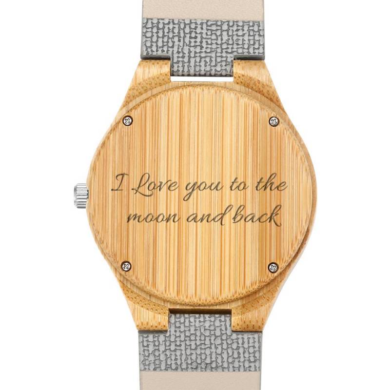 Wocustom-men's Engraved Bamboo Photo Watch Grey Leather Strap 40mm