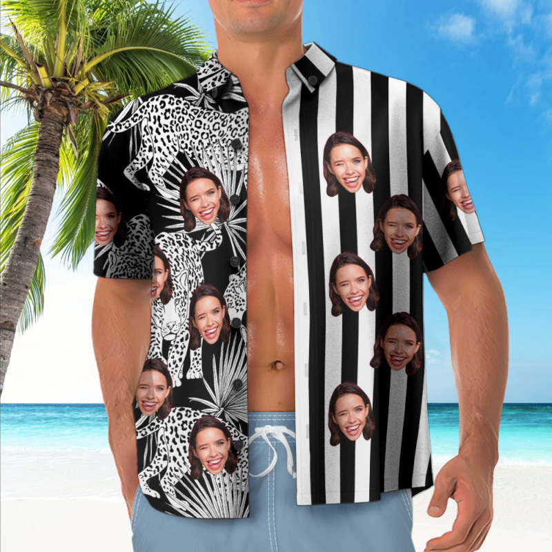 Custom Face Black Striped Hawaiian Shirt Leopard Pattern Hawaiian Shirt