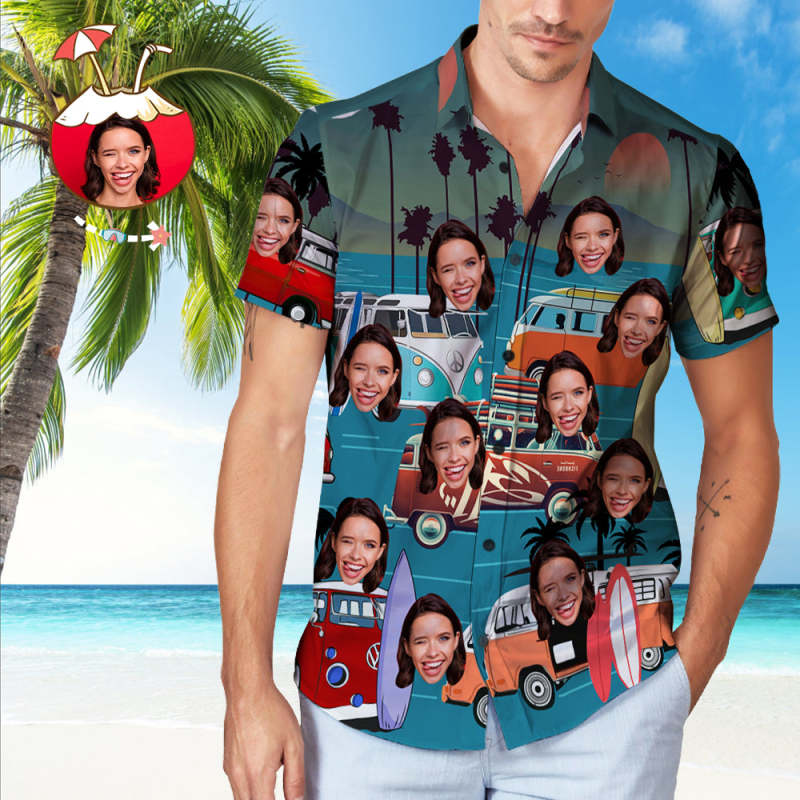 Custom Face Hawaiian Shirt Men's Beach Bus Pattern Hawaiian Shirt