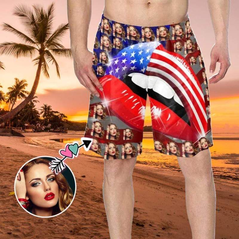 Custom Face Swim Trunks Mens Swim Trunks with Pictures - American Flag with Lips