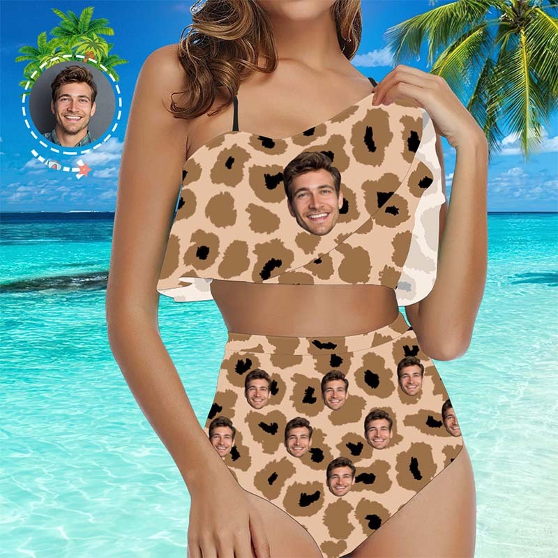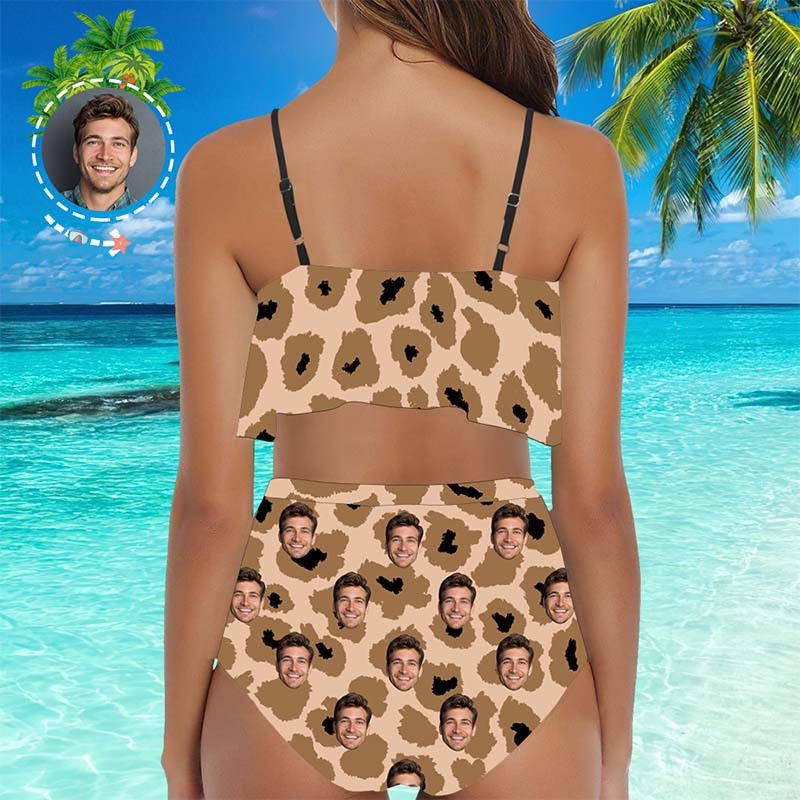 Face Swimsuit Custom Ruffle Bikini with Face High Waisted - Leopard