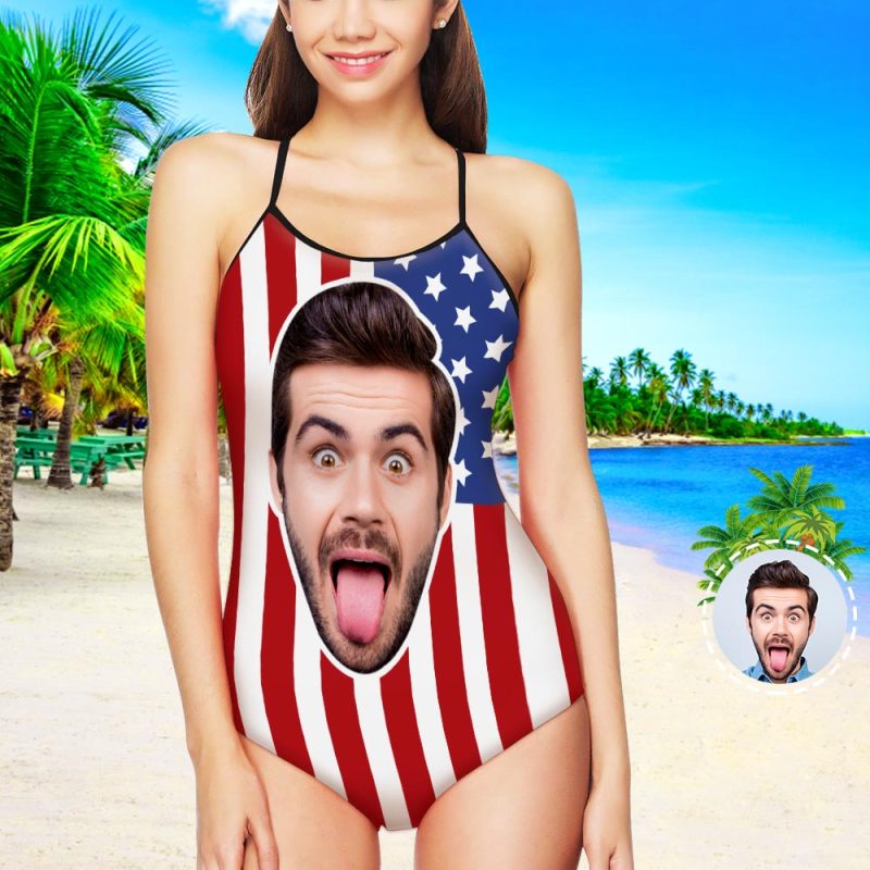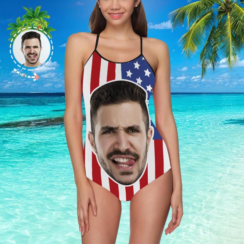 My Face Swimsuit One Piece Swimsuit Custom Bathing Suit with Big Face - American Flag
